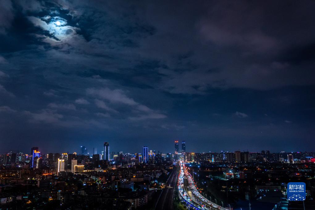 這是9月29日在云南省昆明市拍攝的月亮與城市景觀(guān)。