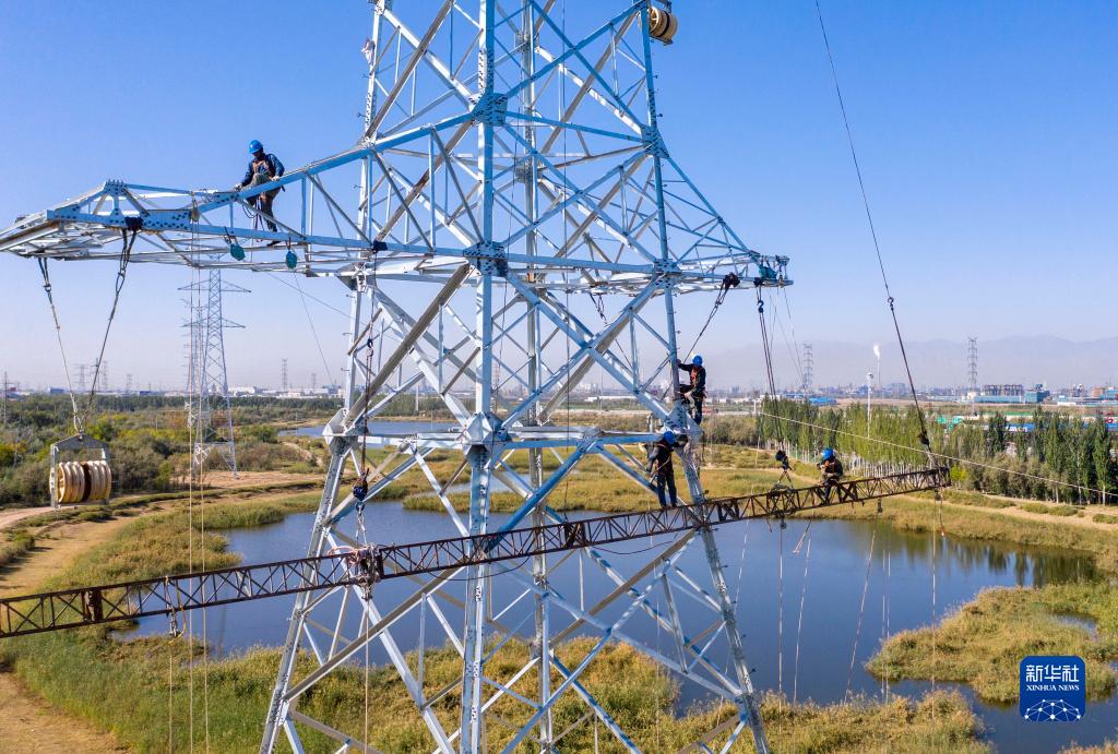 9月30日,工作人員在寧夏石嘴山市平羅縣進(jìn)行沙湖-多晶硅220千伏線(xiàn)路工程跨越公路防護網(wǎng)搭設作業(yè)(無(wú)人機照片)。