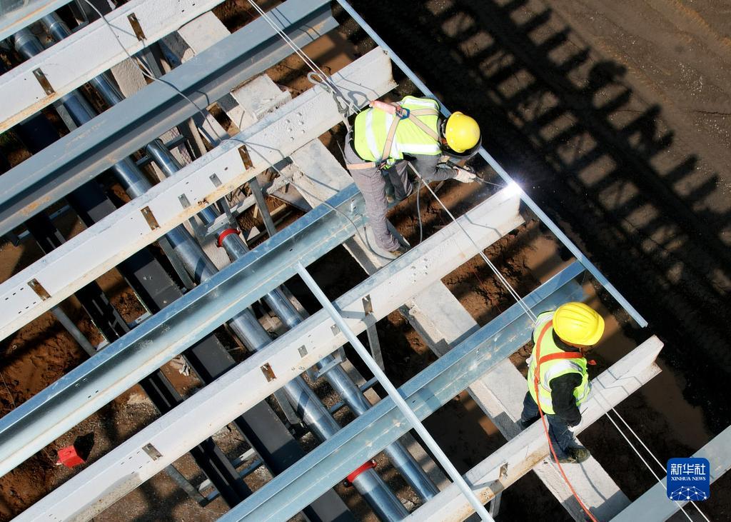 9月30日,中建三局工人在鄭州國際鐵路港西作業(yè)區項目工地進(jìn)行屋面檁條安裝作業(yè)。