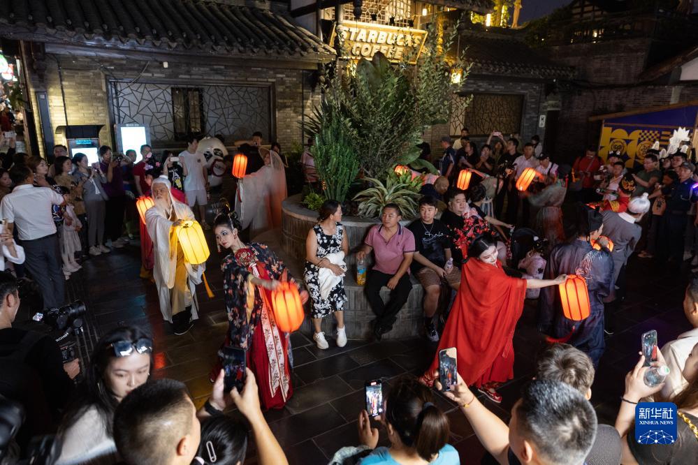 在成都寬窄巷子新“十二月市”街區,裝扮成唐宋時(shí)代人物形象的演員在巡游表演(9月29日攝)。