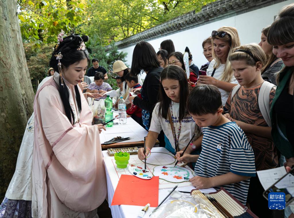 9月30日,人們在德國法蘭克?!按喝A園”中體驗扇面繪畫(huà)。