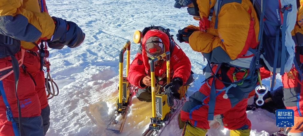 科考隊員用雷達測厚儀,在海拔8201米的卓奧友峰峰頂測量冰雪厚度(10月1日攝)。