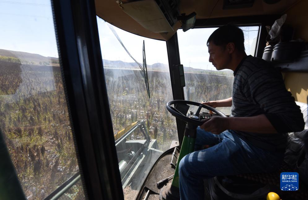 10月1日,在沽源縣白土窯鄉小西溝村,當地農機手王永成在操作收割機收獲藜麥。