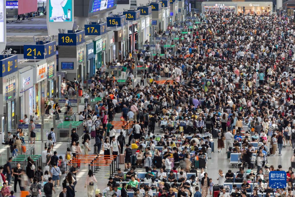 10月1日,上海虹橋火車(chē)站候車(chē)大廳里人頭攢動(dòng)。
