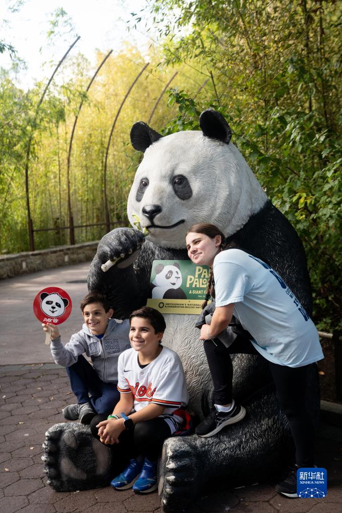 9月30日,在美國華盛頓史密森學(xué)會(huì )國家動(dòng)物園,游客與大熊貓雕塑合影。