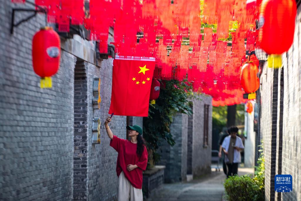 10月1日,游客在江蘇省泰州市海陵區稻河古街區賞景拍照。