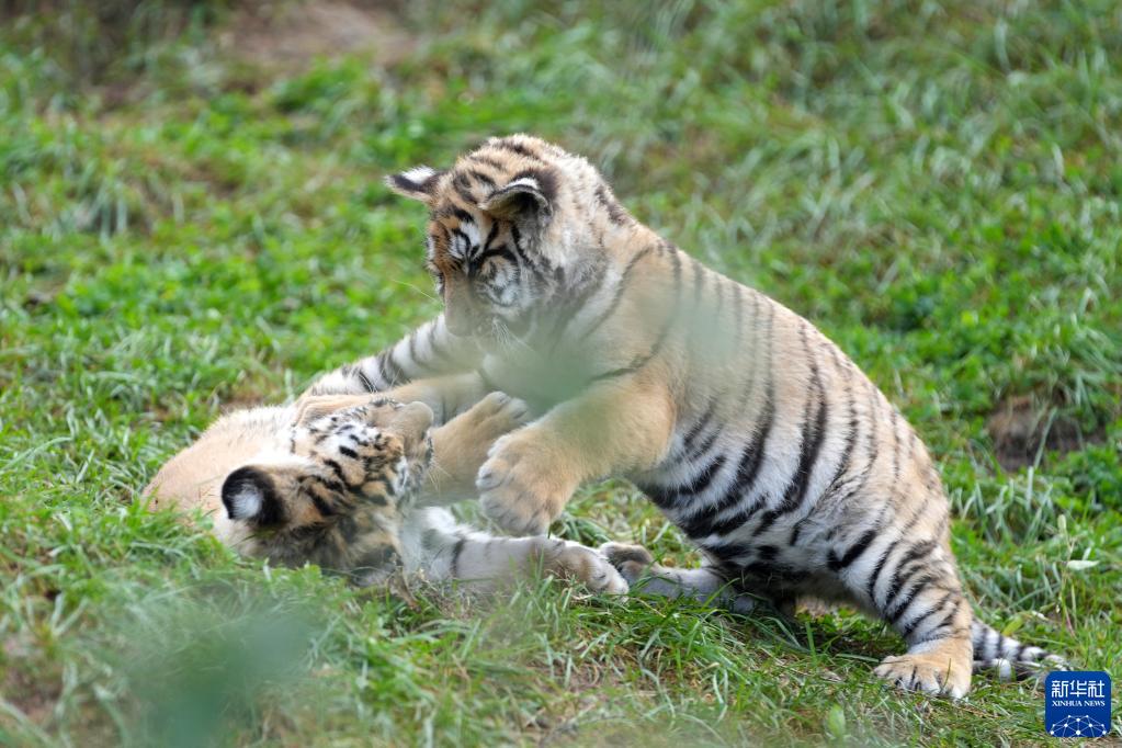 10月1日,橫道河子東北虎林園的幼虎在草地上玩鬧。