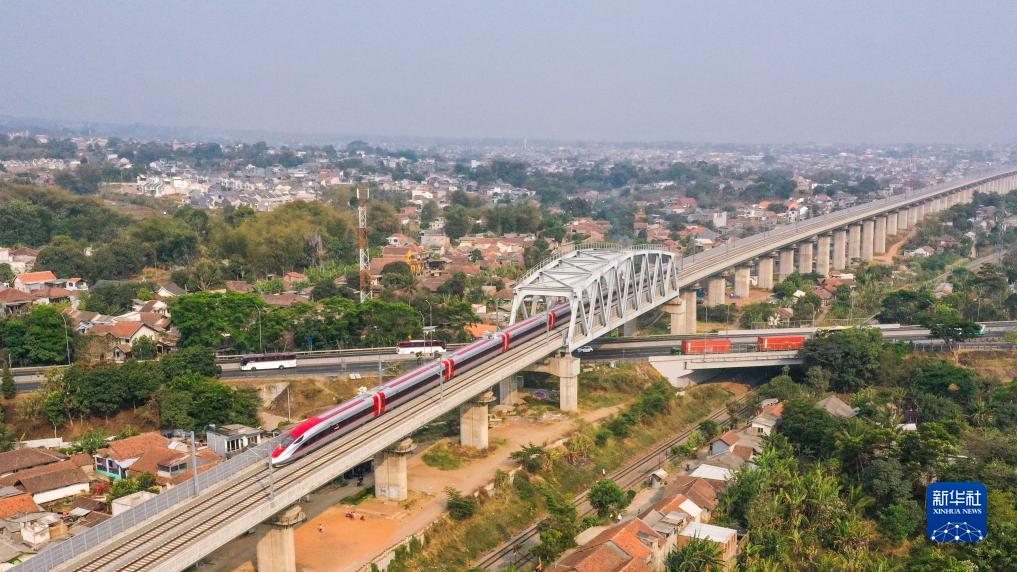 這是9月30日在印度尼西亞帕達拉朗拍攝的一列行駛中的雅萬(wàn)高鐵高速動(dòng)車(chē)組(無(wú)人機照片)。