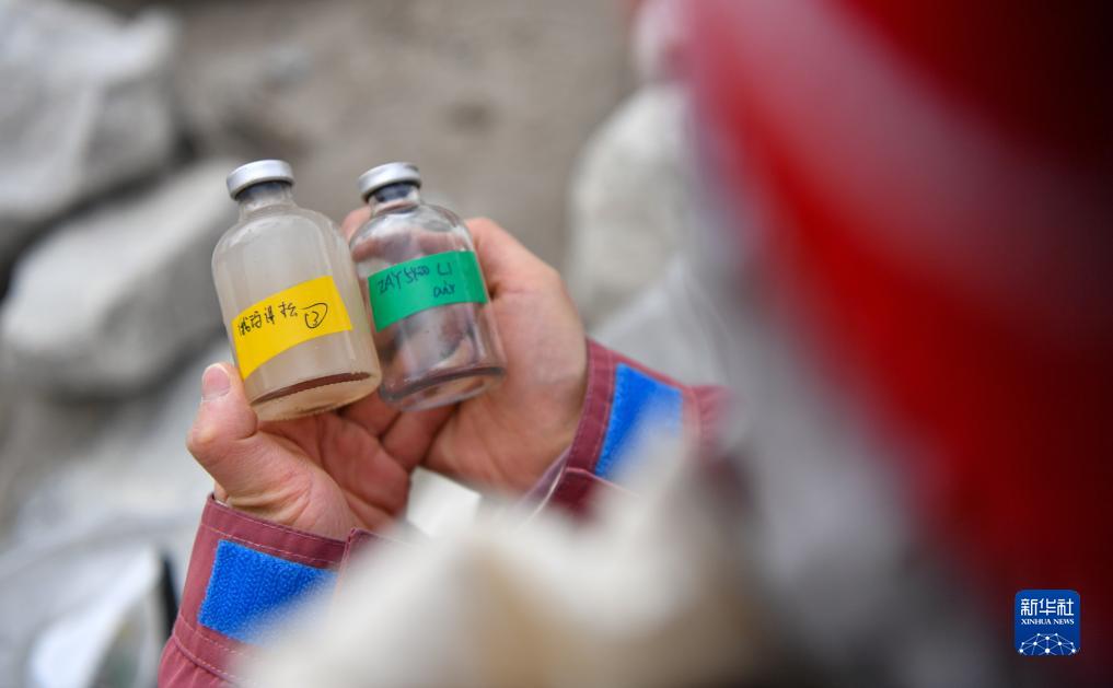 科考隊員查看采集到的水樣,通過(guò)水樣可以觀(guān)測到湖水釋放的甲烷、二氧化碳等氣體的濃度(10月1日攝)。