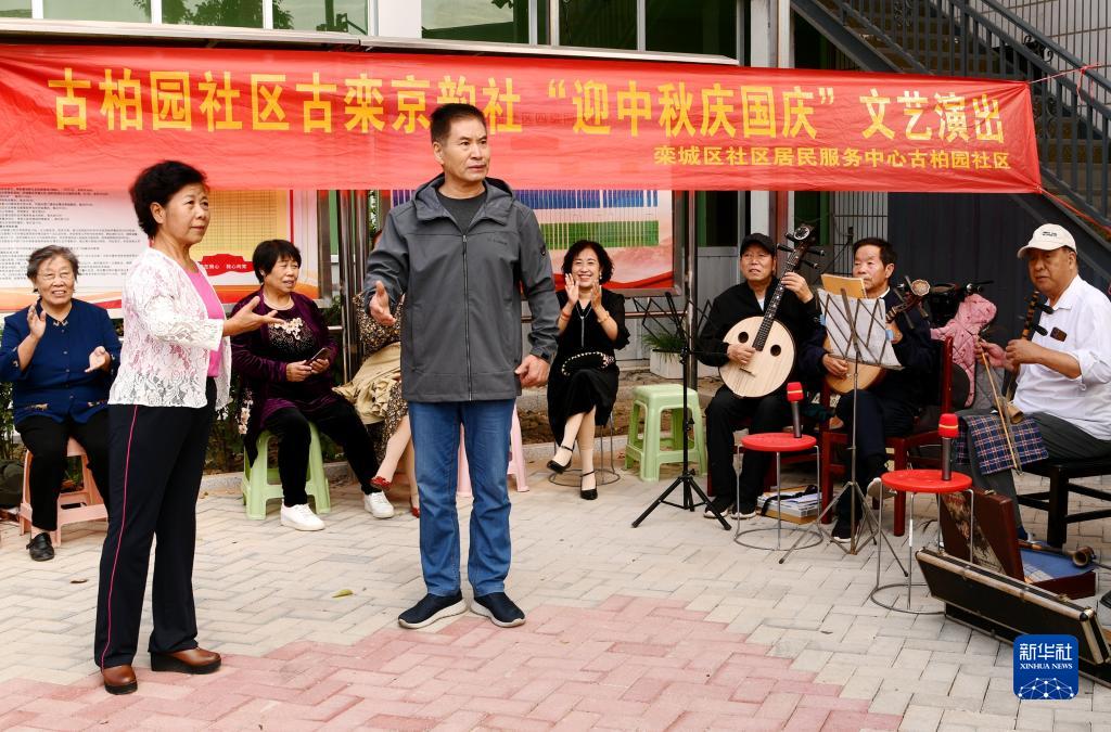 10月2日,戲迷票友在河北省石家莊市欒城區古柏園社區進(jìn)行“迎中秋慶國慶”自?shī)首詷?lè )文藝演出。