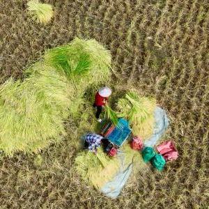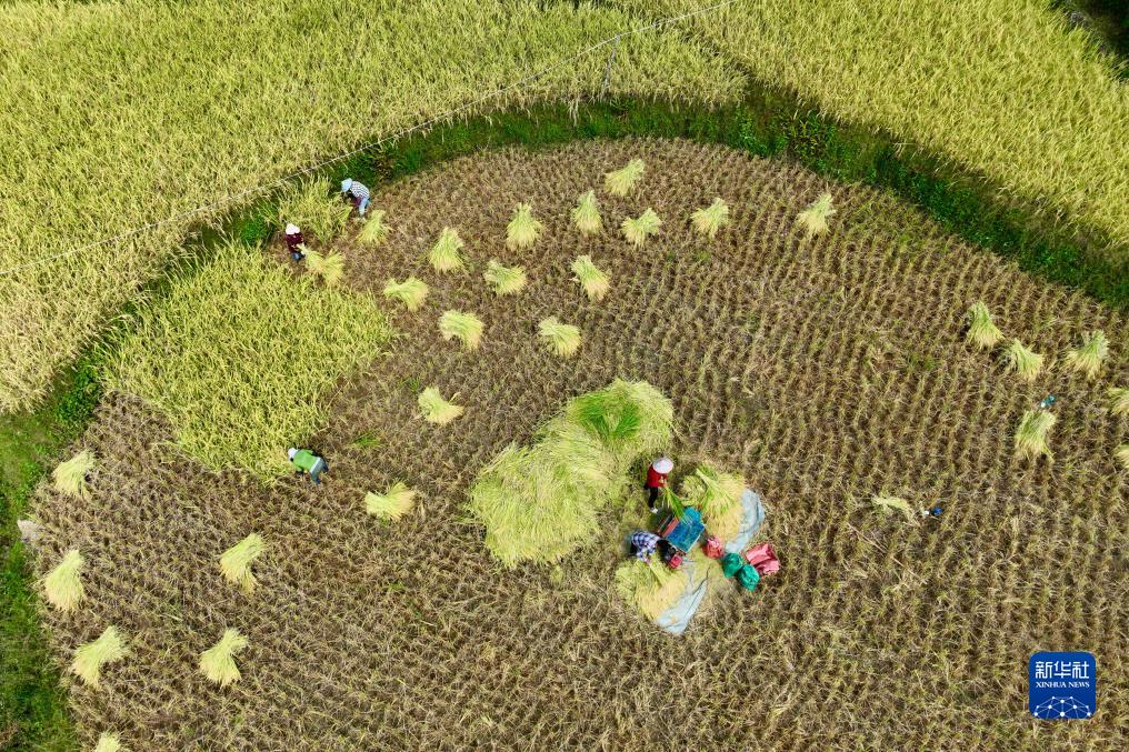 10月2日,福建省永泰縣白云鄉村民在收獲水稻(無(wú)人機照片)。