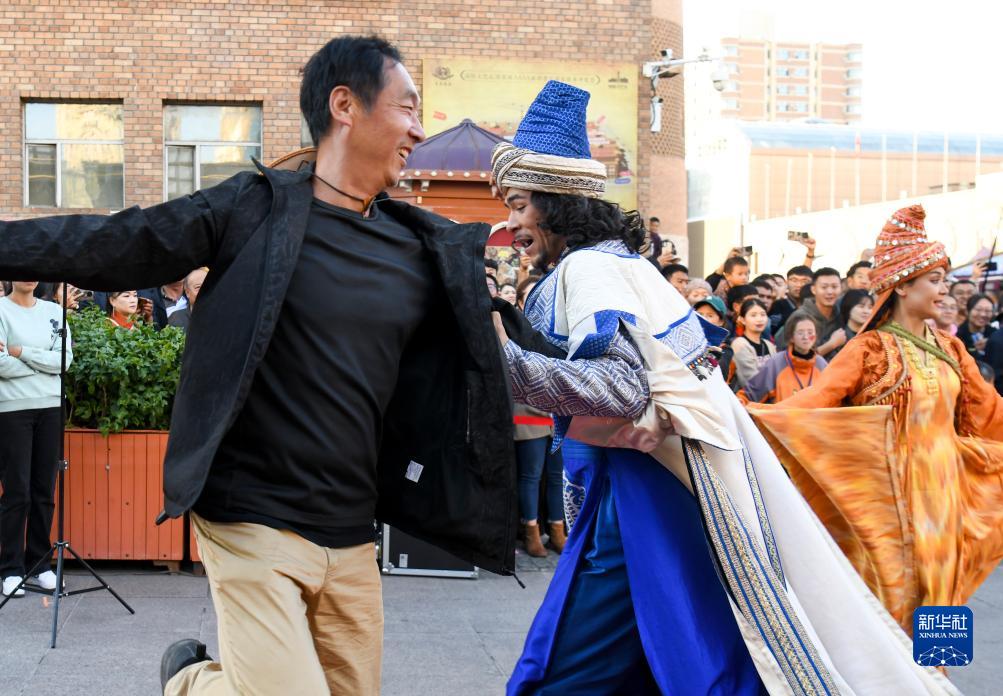 10月2日,在烏魯木齊大巴扎步行街,演員與觀(guān)眾互動(dòng)。