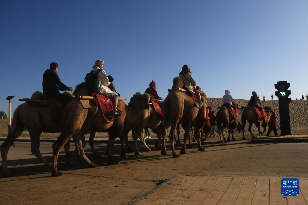 中秋、國慶假期期間,甘肅省敦煌市鳴沙山月牙泉景區迎來(lái)旅游高峰。設置在景區內行人步道和駱駝通道交叉點(diǎn)的交通信號燈“駱駝紅綠燈”引導人、車(chē)和駱駝?dòng)行蛲ㄐ?,確保了景區交通安全暢通。