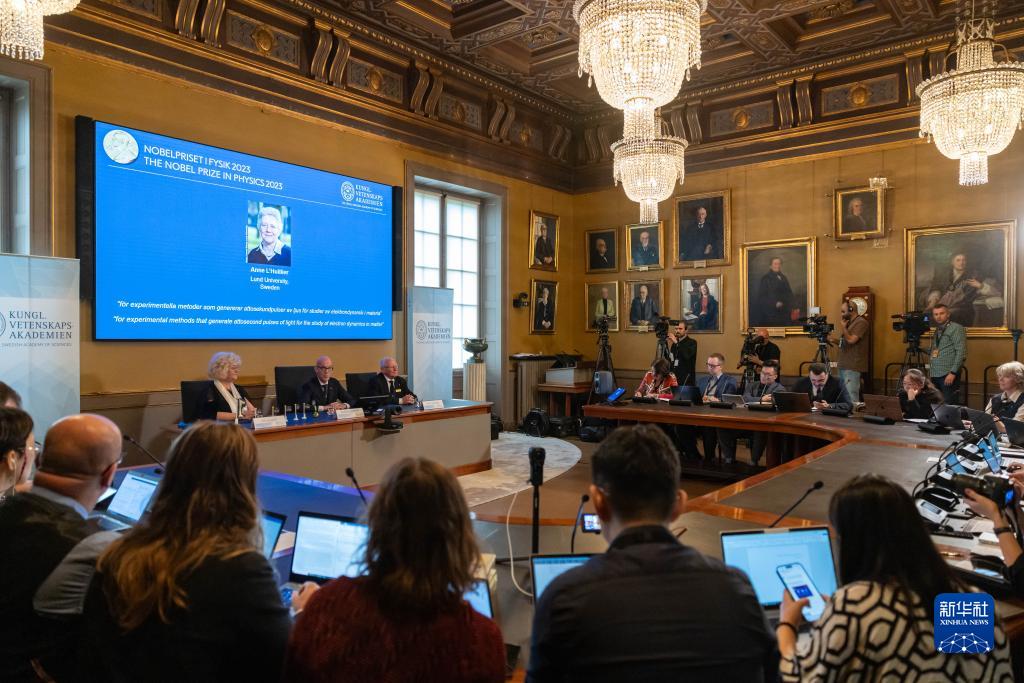 這是10月3日在瑞典斯德哥爾摩拍攝的2023年諾貝爾物理學(xué)獎公布現場(chǎng)。
