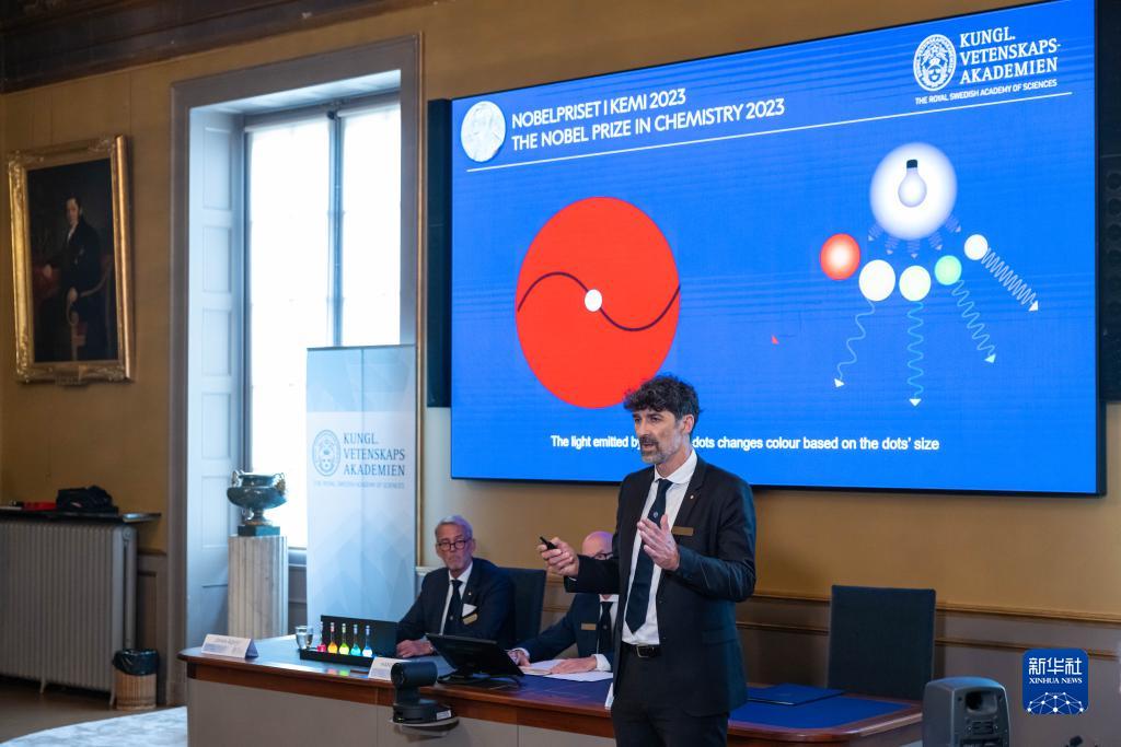 10月4日,在瑞典斯德哥爾摩的2023年諾貝爾化學(xué)獎公布現場(chǎng),評委會(huì )專(zhuān)家解讀今年諾貝爾化學(xué)獎得主的研究成果。