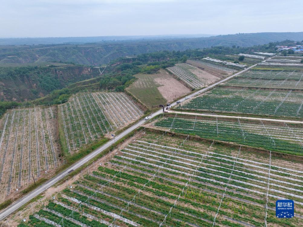 宜川縣云巖鎮北赤村完成新品種改造的蘋(píng)果園(9月27日攝,無(wú)人機照片)。
