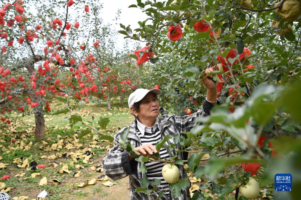 9月27日,宜川縣云巖鎮太吉村果農在果園給蘋(píng)果摘袋。