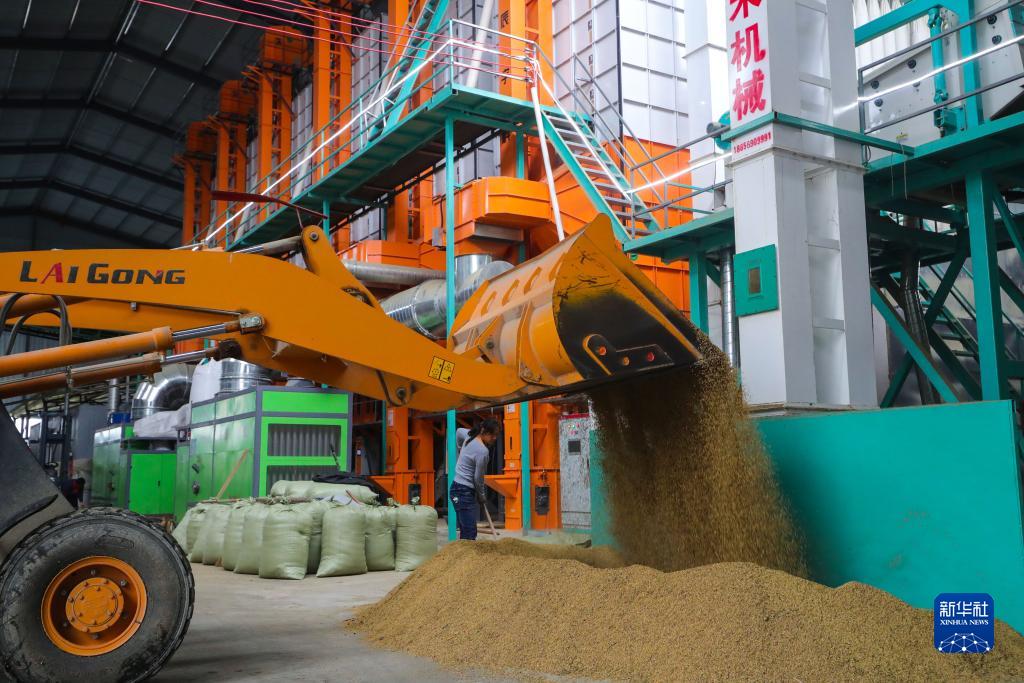10月2日,在河南省信陽(yáng)市光山縣羅陳鄉張樓村青龍河合作社大型機械化水稻烘干中心,工作人員進(jìn)行烘干水稻作業(yè)。