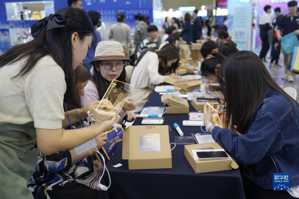 10月5日,人們在韓國釜山國際旅游展上制作手工。新華社記者 陸睿 攝