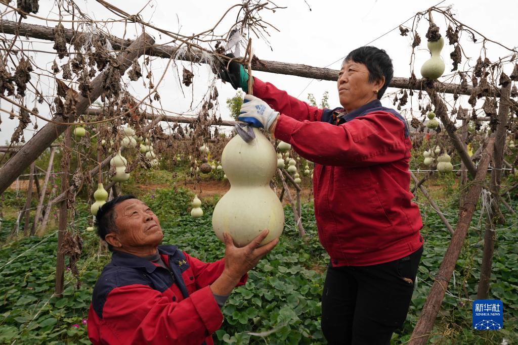 10月5日,河北省邢臺市信都區會(huì )寧鎮張爾莊村村民在葫蘆園內采摘葫蘆。