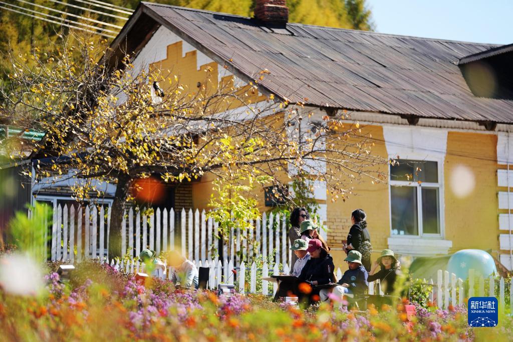 10月2日,學(xué)生在橫道河子鎮的文化藝術(shù)主題街區寫(xiě)生。