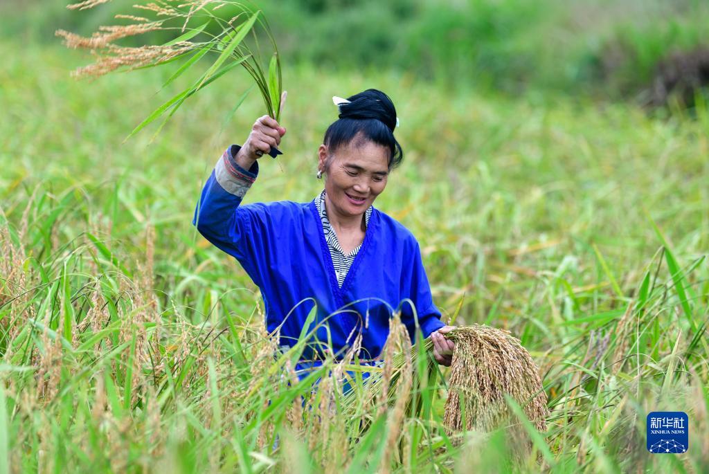10月6日,農民在貴州省黎平縣雙江鎮黃崗村收割稻谷。
