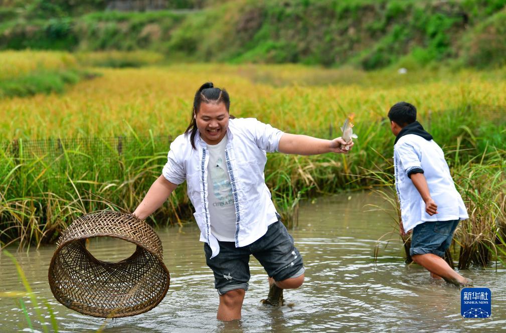 10月5日,貴州省黎平縣雙江鎮黃崗村的年輕人在秋收后的稻田里抓魚(yú)。