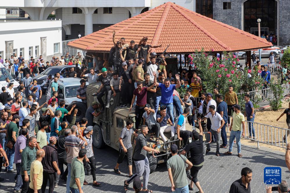 10月7日,在加沙城,巴勒斯坦人登上一輛以色列軍用車(chē)輛。