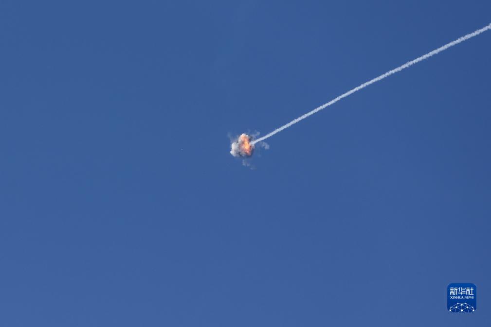10月7日,在以色列南部城市阿什克隆,以色列“鐵穹”防御系統導彈成功攔截從加沙地帶發(fā)射的火箭彈。