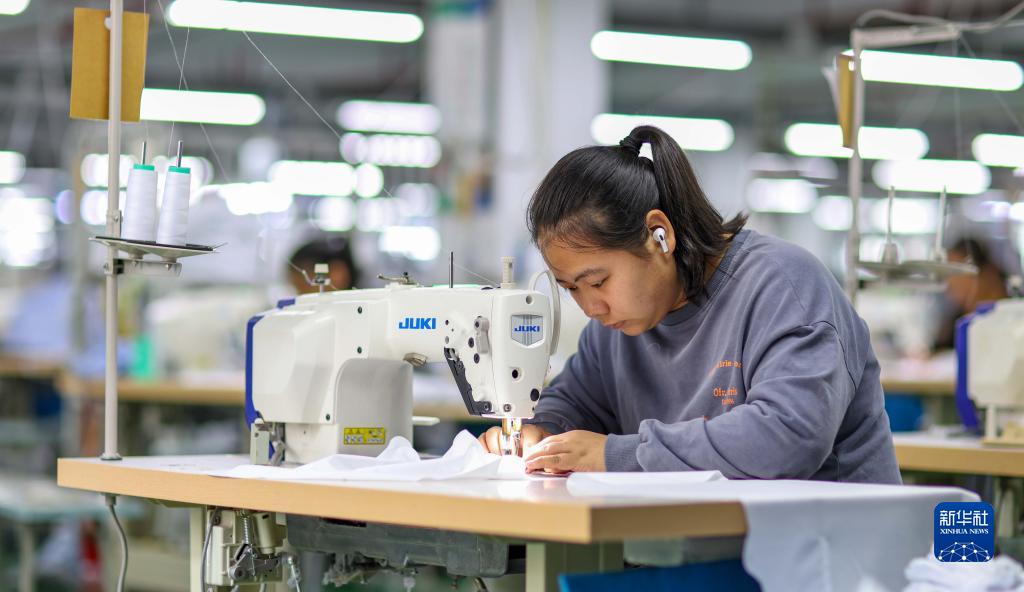 10月7日,貴州省銅仁市玉屏侗族自治縣一家服裝生產(chǎn)企業(yè)的工人在生產(chǎn)服裝。
