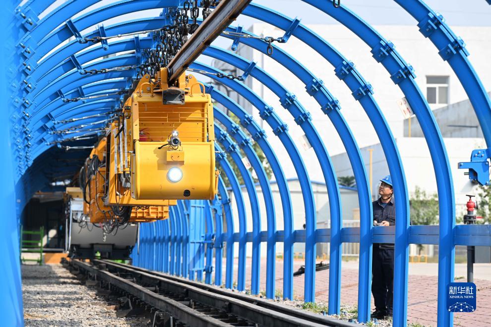 10月7日,工人在石家莊裝備制造產(chǎn)業(yè)園石煤機公司調試無(wú)人駕駛鋰電單軌吊。