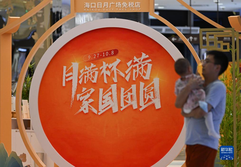 9月29日在中免集團??谌赵聫V場(chǎng)免稅店拍攝的促銷(xiāo)海報。