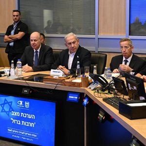 10月7日,以色列總理內塔尼亞胡(前排右五)出席在特拉維夫舉行的安全內閣會(huì )議。