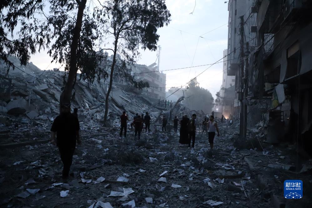 10月7日,巴勒斯坦民眾在加沙城查看以色列空襲后毀壞的民宅。