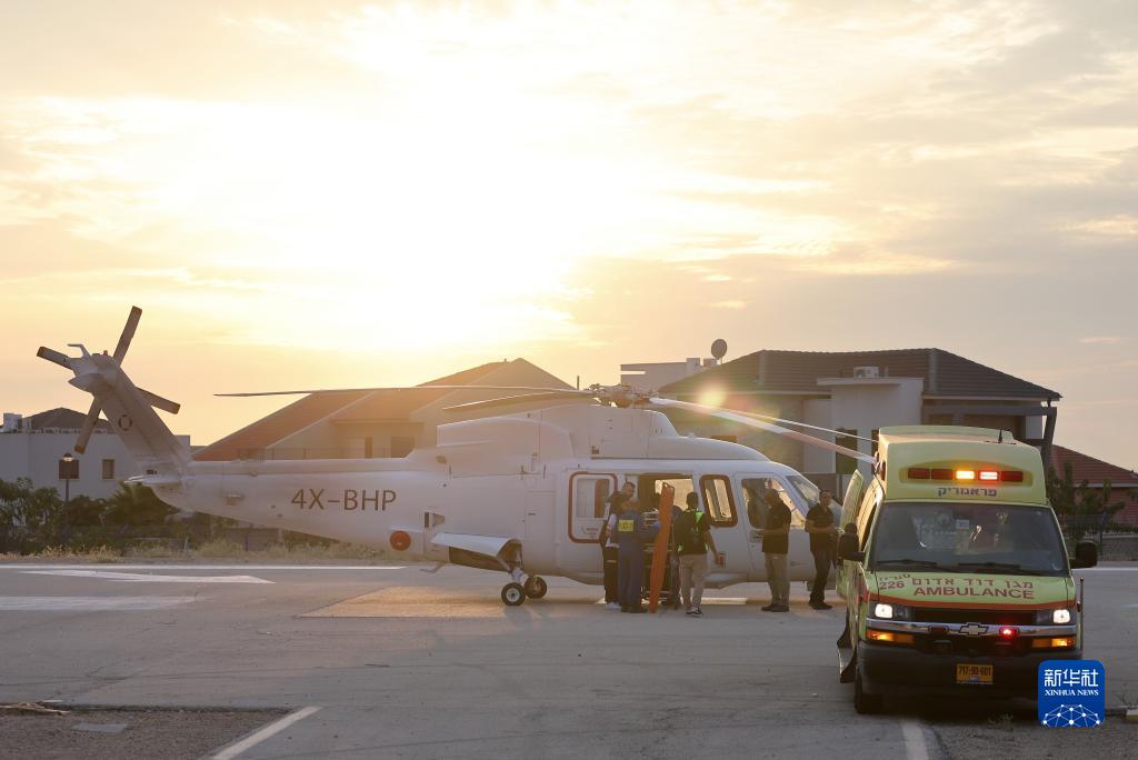 10月7日,在以色列南部城市阿什凱隆,直升機轉運傷者接受治療。