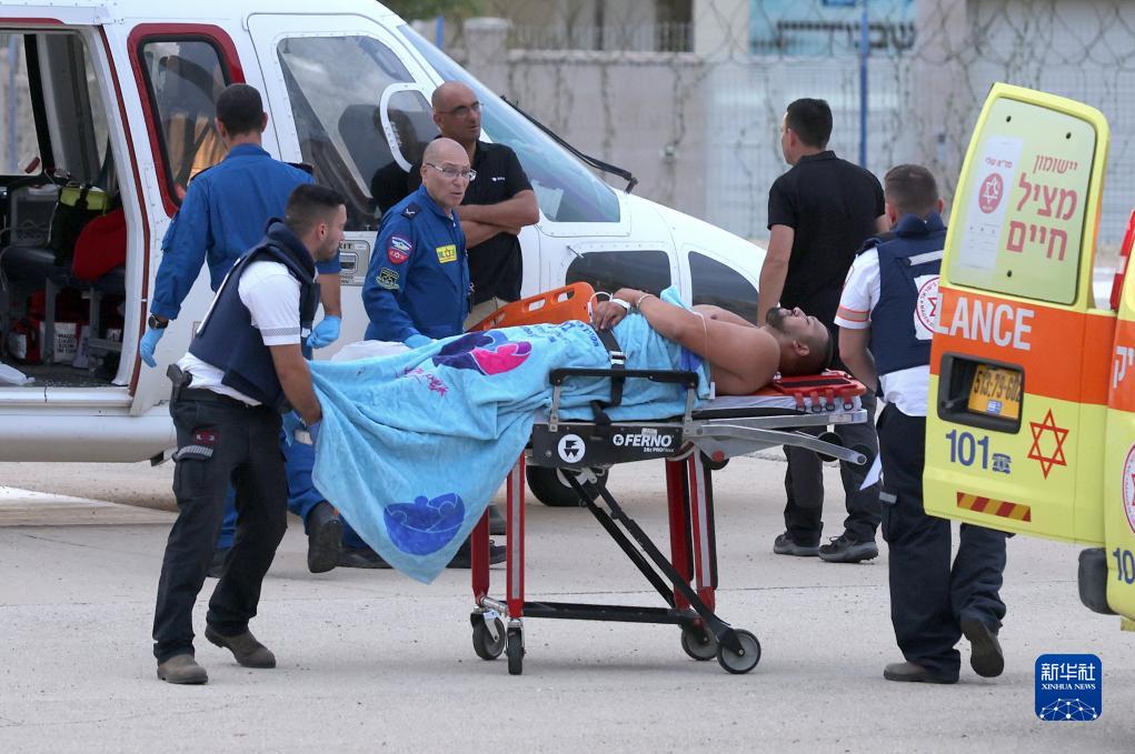 10月7日,在以色列南部城市阿什凱隆,傷者被直升機轉運接受治療。