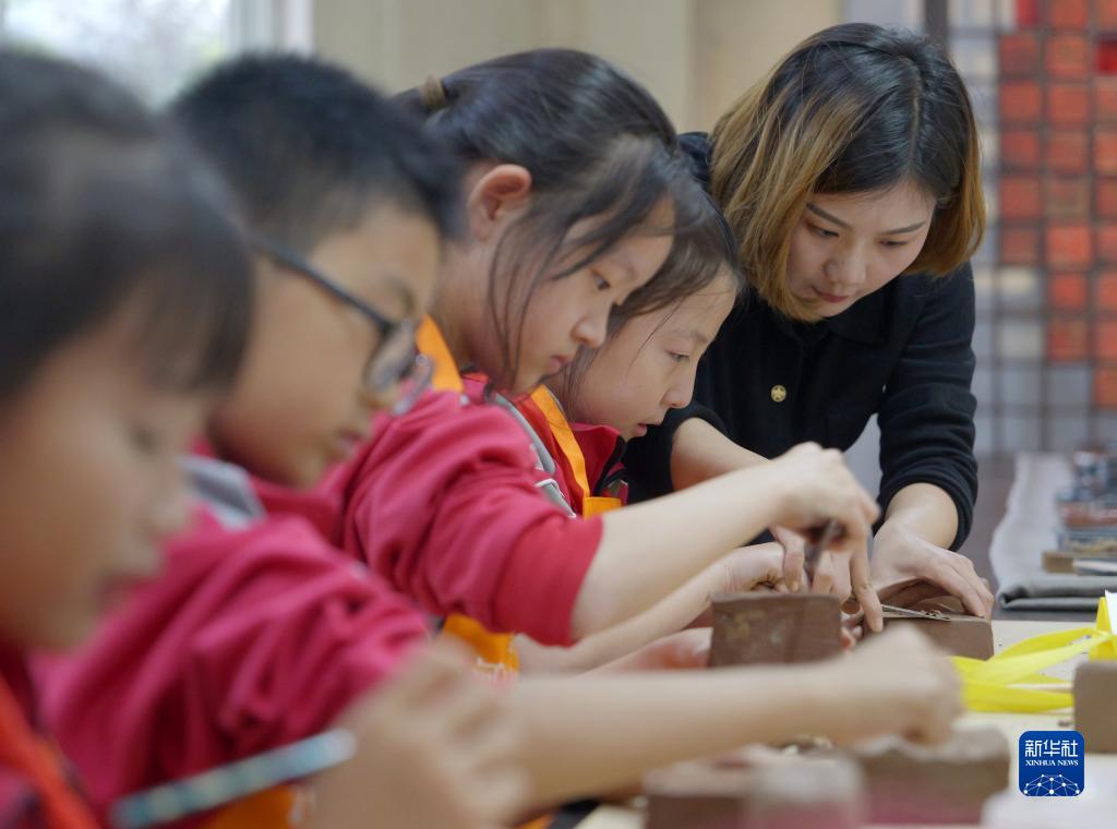 10月7日,在河南省洛陽(yáng)市新安縣河洛澄泥硯藝術(shù)館,游曉曉在教小學(xué)生制作澄泥硯。