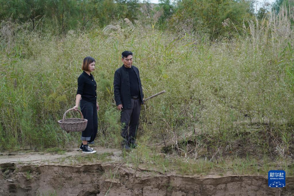 10月7日,在黃河河南洛陽(yáng)段,游曉曉(左)與父親一起去黃河邊采泥。