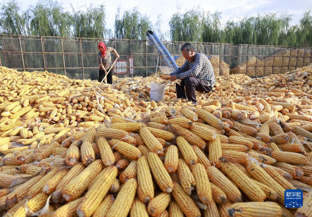 10月4日,河北唐山豐南區唐坊鎮孔家莊村的農民在剝玉米皮。