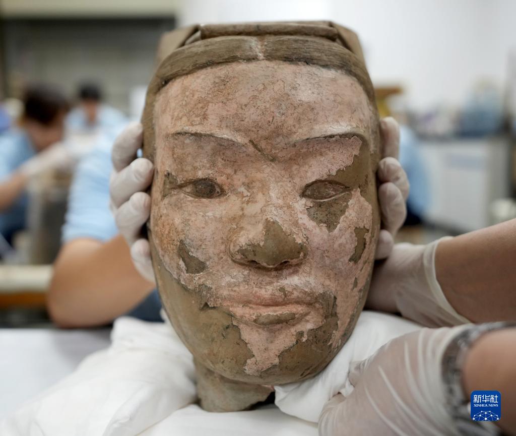 這是秦俑俑頭彩繪還原修復后的樣貌(8月23日攝)。