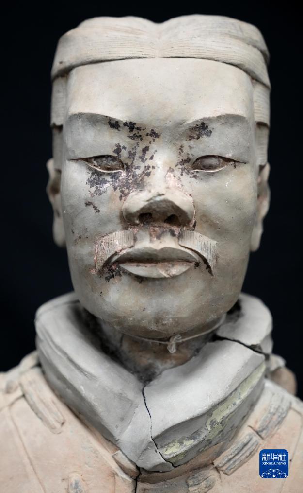 這是秦俑臉部和衣領(lǐng)上的彩繪還原修復后的樣貌(8月23日攝)。