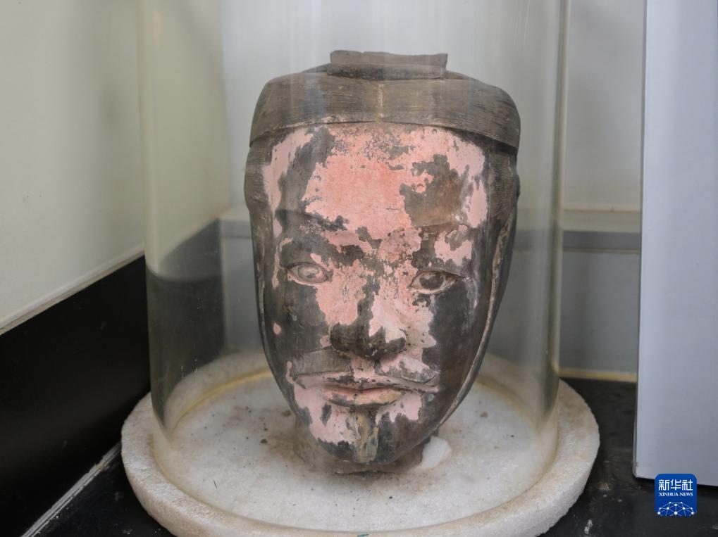 在秦始皇帝陵博物院文物保護部彩色陶俑修復室內,一尊彩色秦俑俑頭被放在玻璃罩中保護(8月23日攝)。