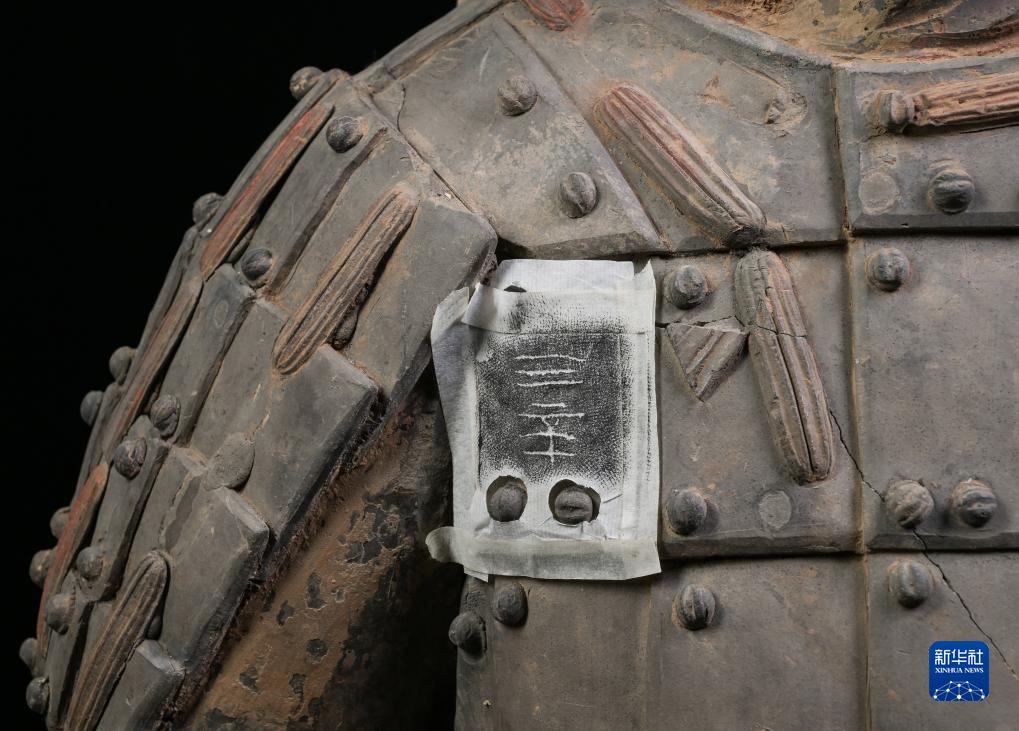 在秦始皇帝陵博物院文物保護部彩色陶俑修復室內,修復人員使用墨拓技術(shù)在一尊秦俑的胸前甲片上還原出“三辛”字樣的刻痕。據介紹,這應是制作該秦俑的秦代工匠名(8月23日攝)。