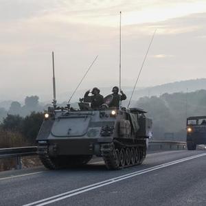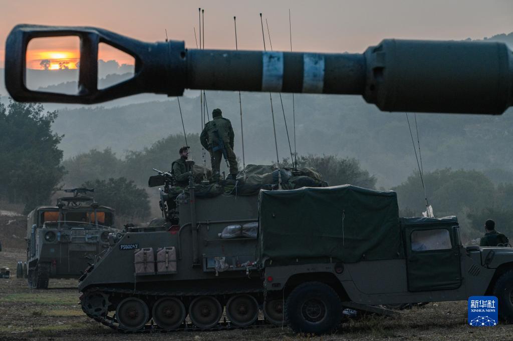 這是10月8日在以色列北部靠近黎巴嫩的邊境區域拍攝的以色列軍用車(chē)輛。