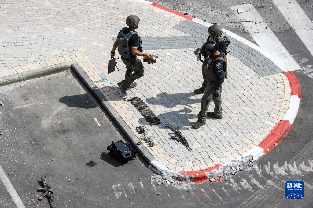 10月8日,在以色列南部城市斯代羅特,從哈馬斯武裝人員手中繳獲的武器和裝備被擺放在地上。