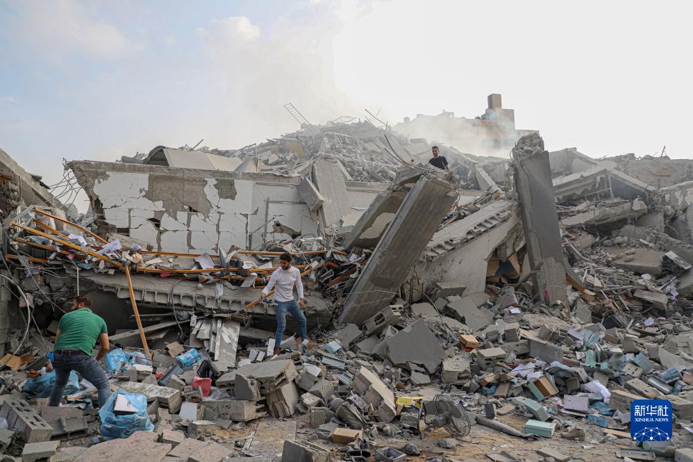 10月8日,在加沙城,巴勒斯坦人查看以色列空襲后的建筑廢墟。