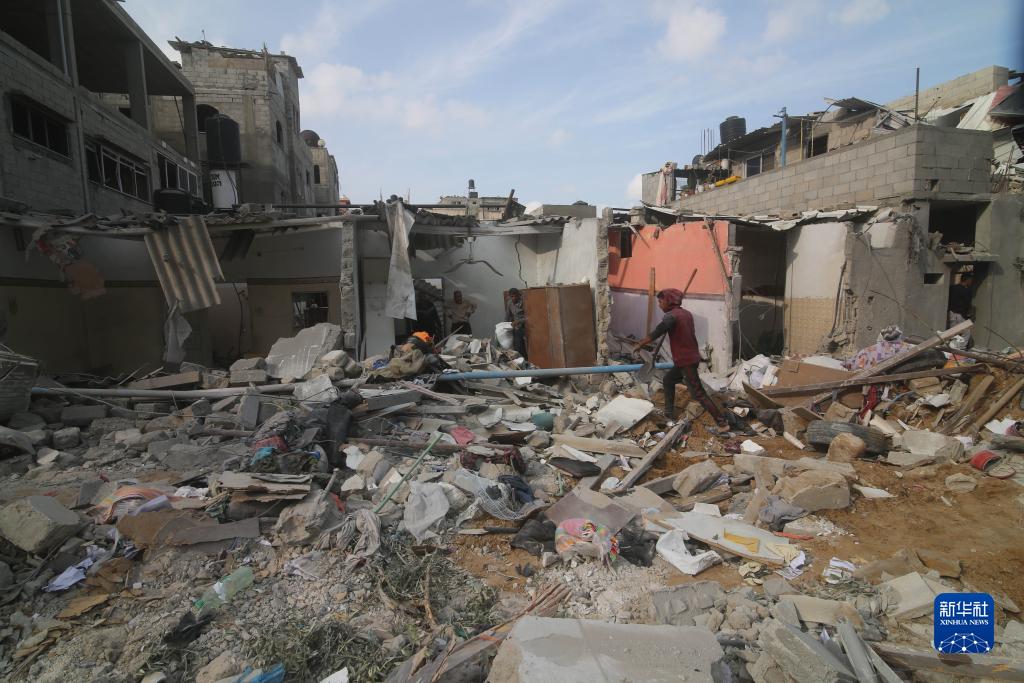 10月8日,在加沙地帶南部城市拉法,人們查看被以色列空襲炸毀的建筑。
