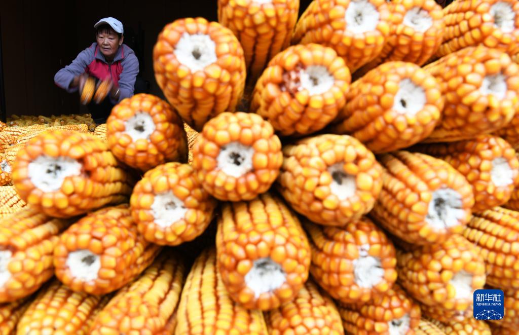 10月8日,在云南省麗江市古城區金山街道金山社區,農民整理收獲的玉米。