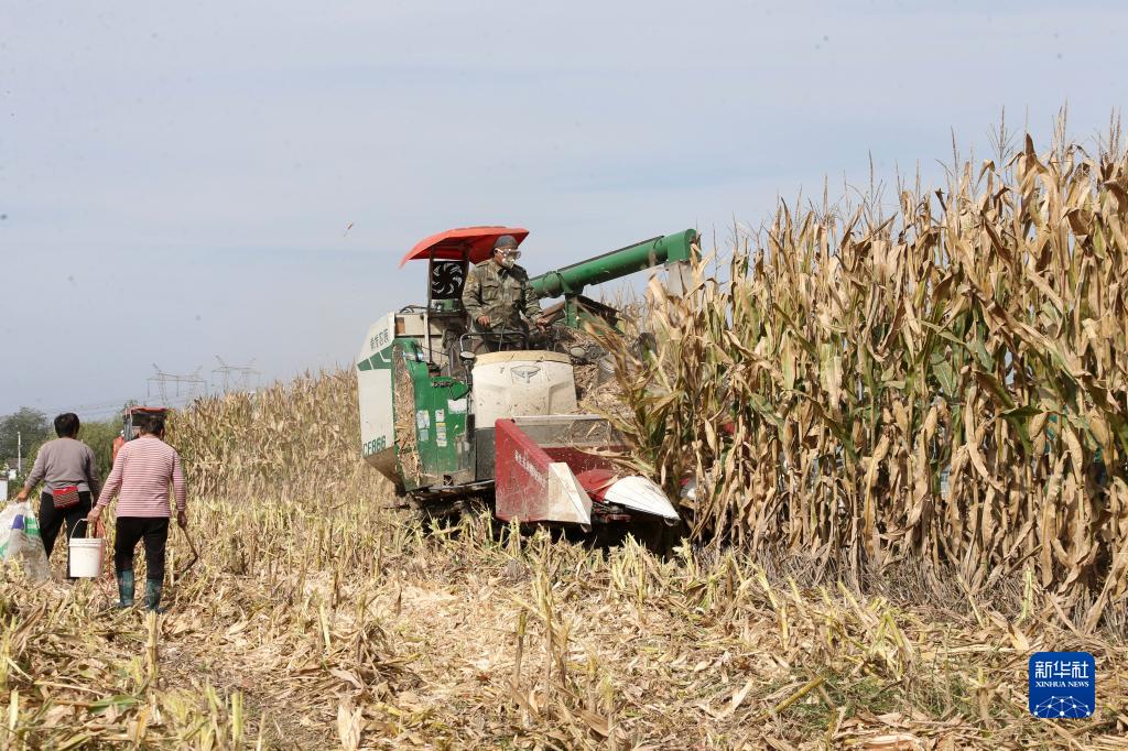 10月8日,農民駕駛收割機在河南省駐馬店市驛城區水屯鎮水屯村搶收玉米。