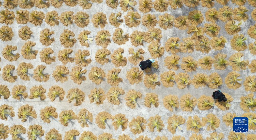 10月8日,村民在貴州省黔東南苗族侗族自治州從江縣剛邊壯族鄉剛邊村晾曬剛收獲的糯稻(無(wú)人機照片)。